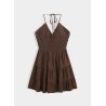 Robe courte à encolure en V avec fronces. Bretelles fines à nouer autour du cou. Détail smocké au dos. Jupe évasé. Matière légère à effet texturé.